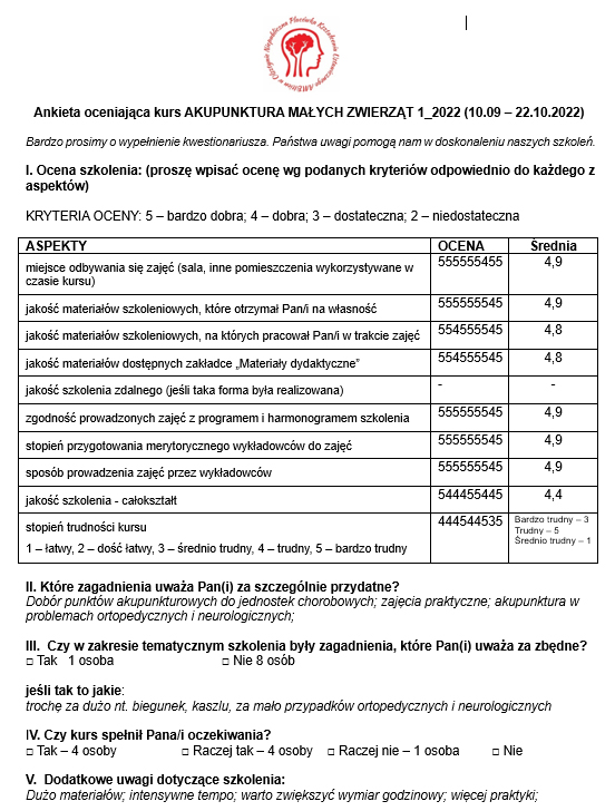 Należy podkreślić, że w akupunkturze także obowiązuje zasada primum non nocere, więc prowadząca kurs p. Emilia Ewertowska bardzo zwracała uwagę na to, żeby wkłucia były pomocne w konkretnych dolegliwościach pacjentów. Żaden pies nie ucierpiał, a wręcz każdy zyskał na zdrowiu.