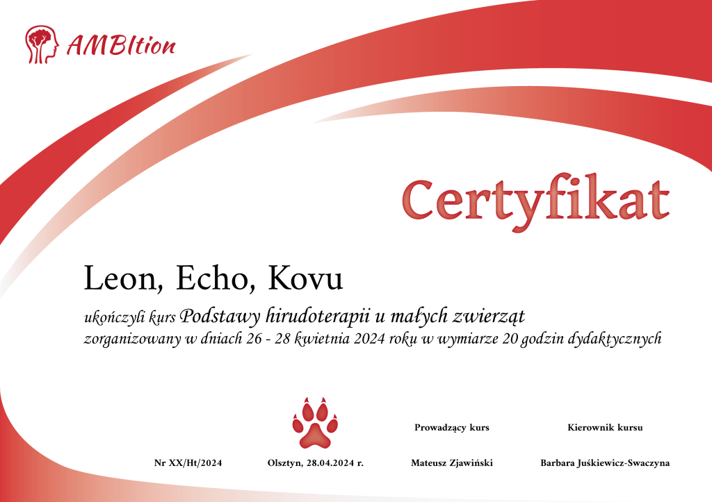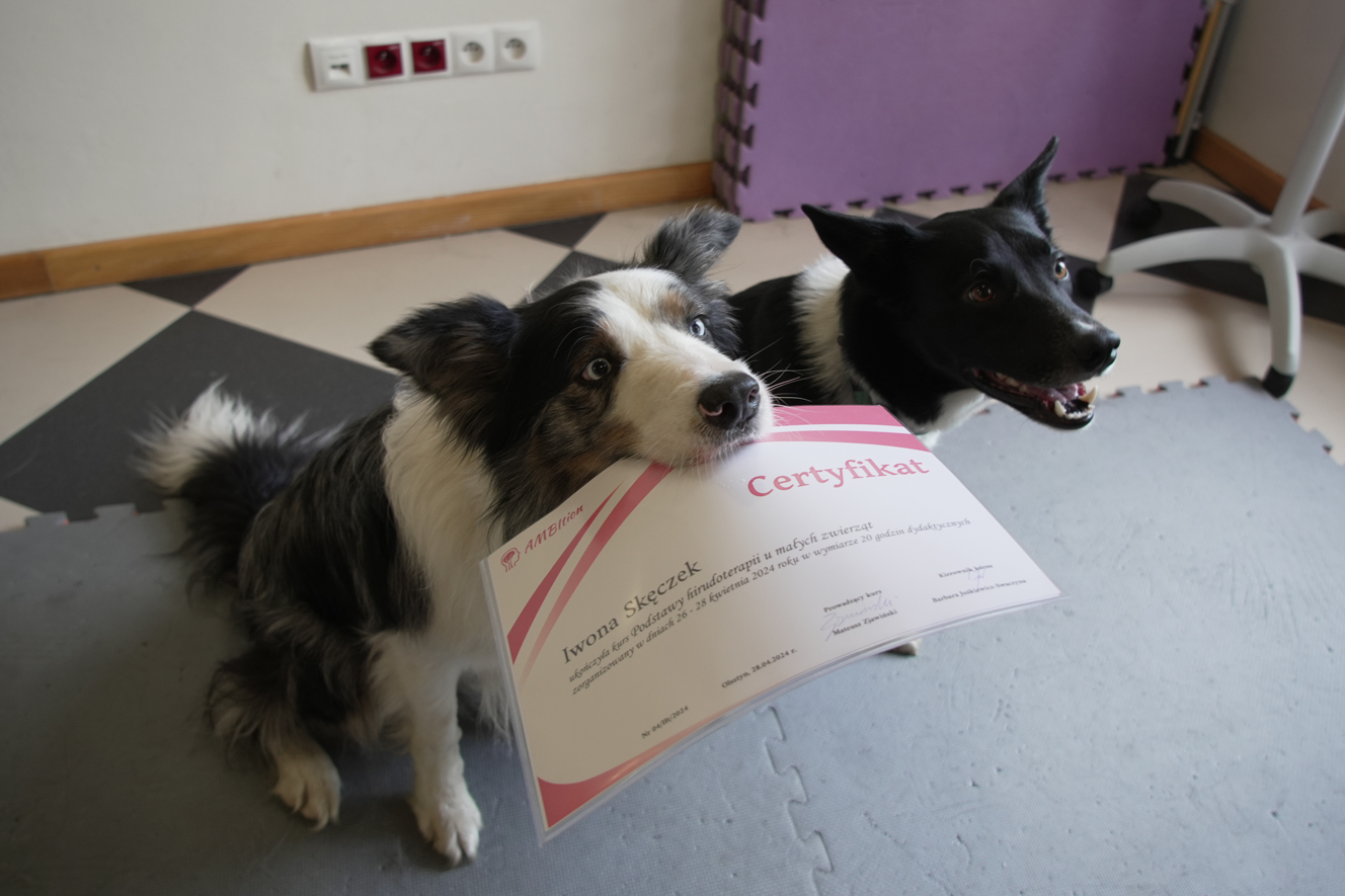 Dlatego postanowiliśmy zainteresować hirudoterapią osoby zajmujące się leczeniem i rehabilitacją małych zwierząt. Kurs w AMBItion poprowadził Mateusz Zjawiński – doświadczony hirudoterapeuta, fizjoterapeuta, biolog i dietetyk kliniczny. Zaproszenie na kurs jako pierwsze przyjęły zoofizjoterapeutki. Otrzymały dużą porcję wiedzy teoretycznej, miały okazję zapoznać się krok po kroku z metodyką stosowania pijawek u zwierząt.