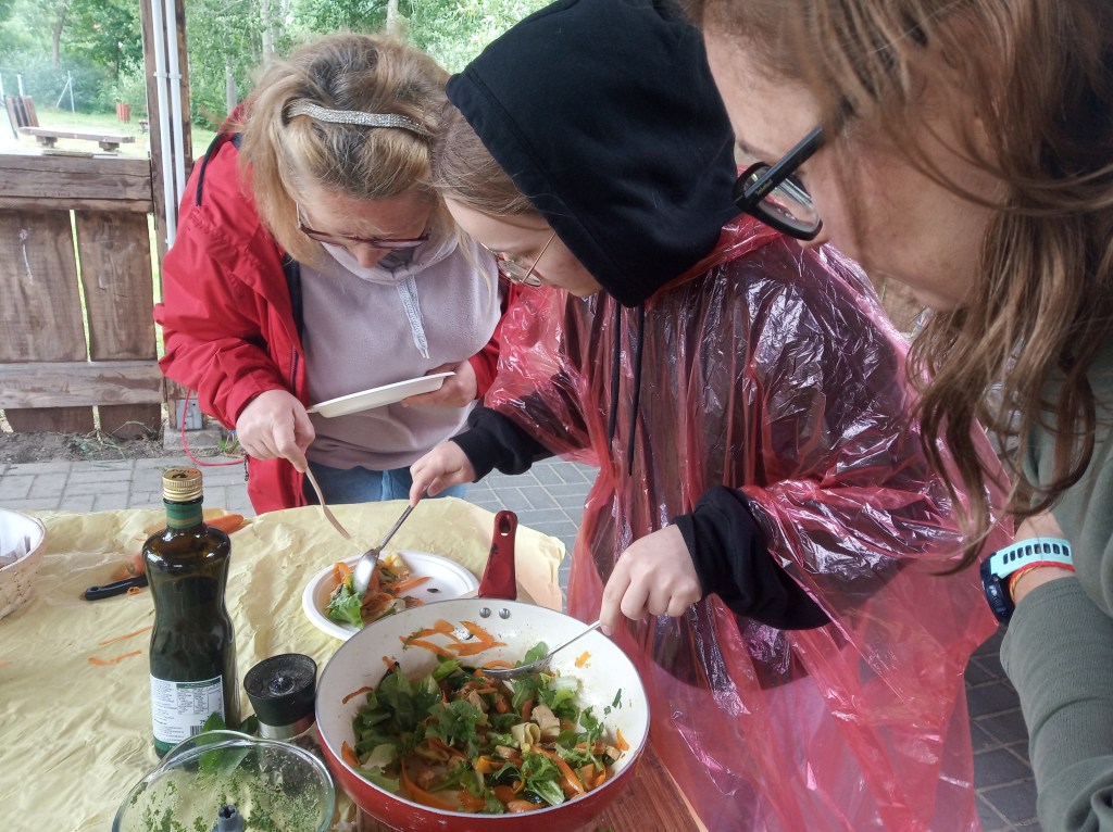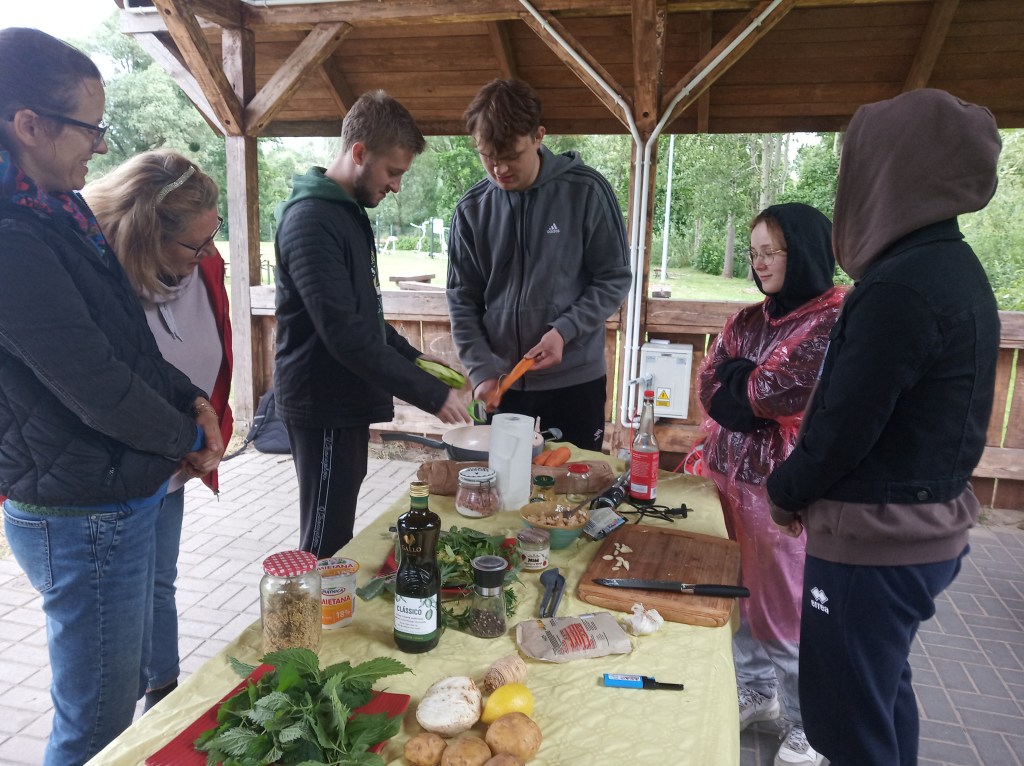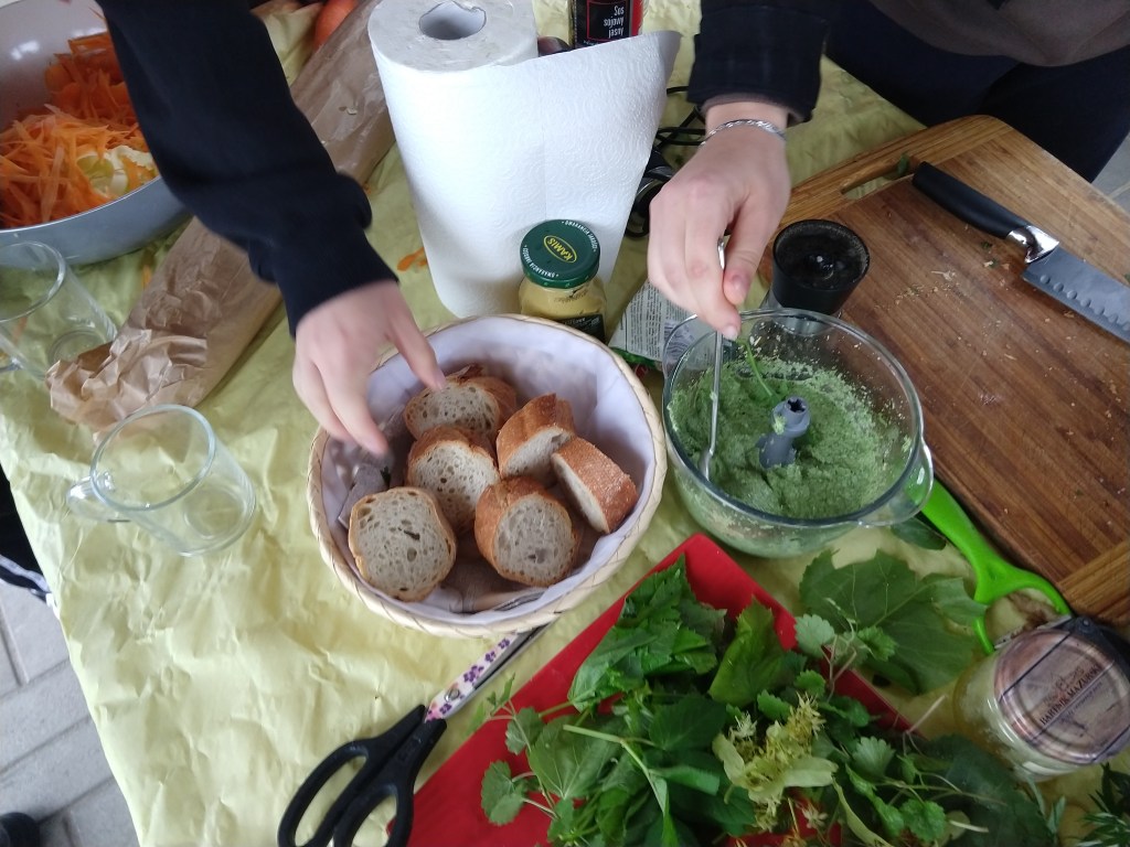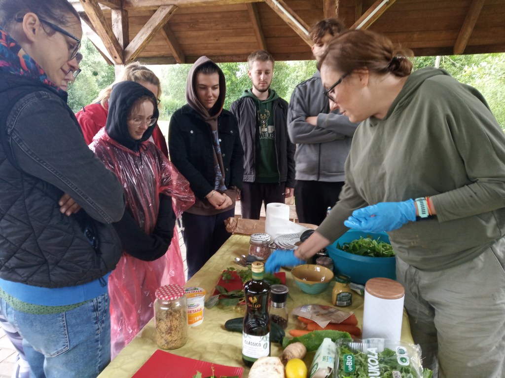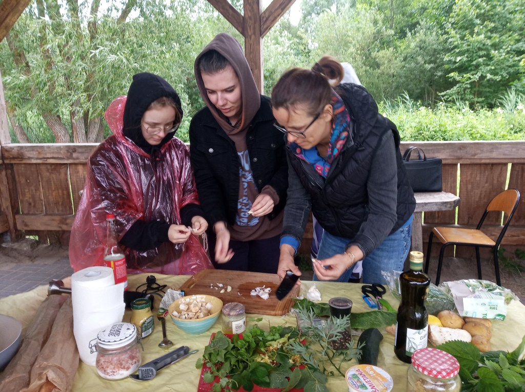 Na zakończenie kursu „smaczny” sprawdzian znajomości gatunków roślin – warsztat „dzika kuchnia”. Herbata z kwiatów lilaka, pesto z podagrycznika, zupa z pokrzywy przyprawiona listkami bluszczyka kurdybanka i sałatka z liśćmi lipy. Wszystko zaskakująco smaczne, a co najważniejsze zdrowe!